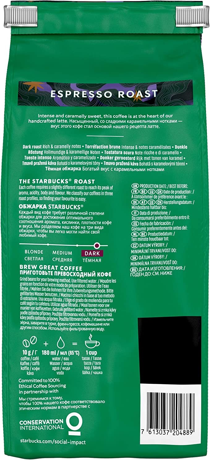 Starbucks Espresso Black Roasted Coffee Beans 450g Bag (Pack of 4)
