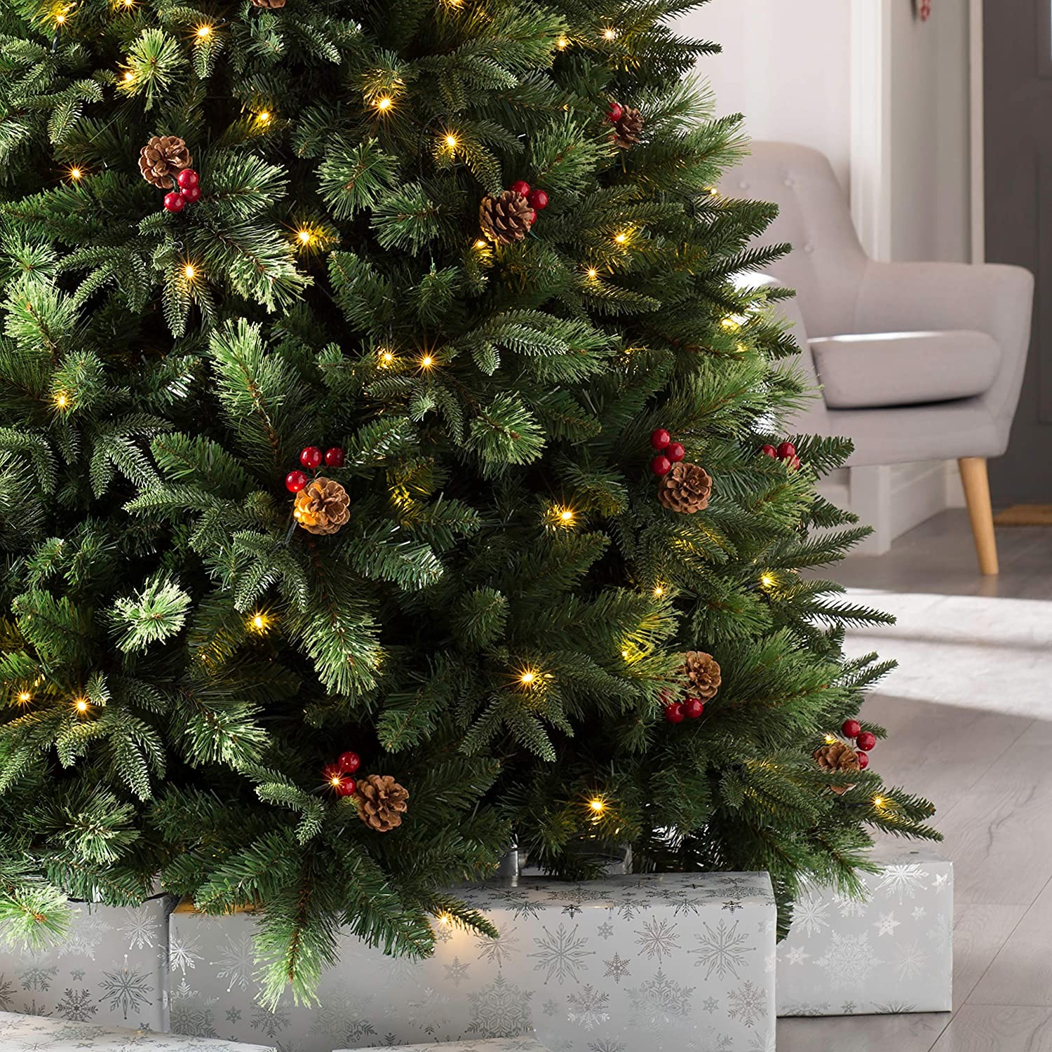 The tree has a hinged construction and boasts 1236 mixed tips for a realistic natural look