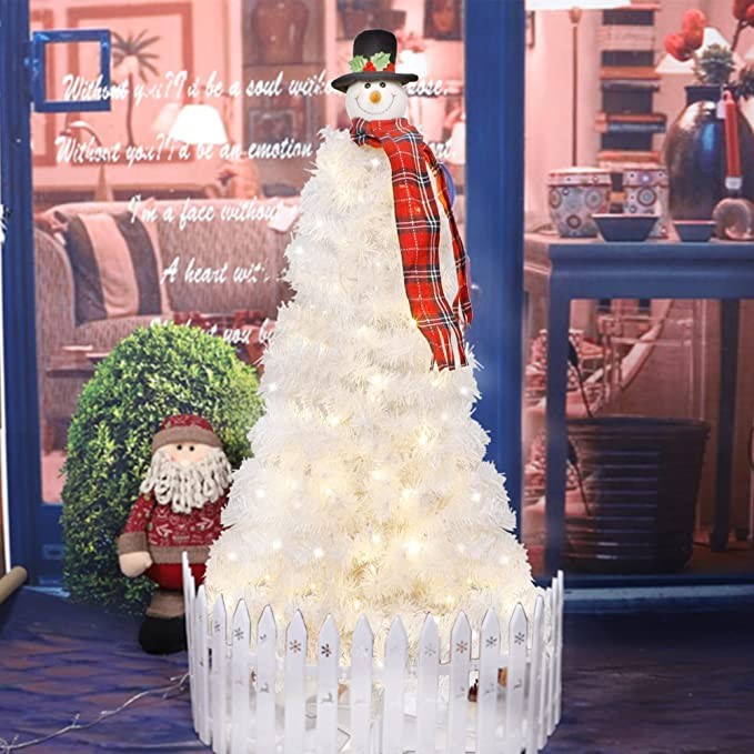 Increase the beauty and light up your home with this 4FT White Salem Pencil Christmas tree with snowman tree topper.